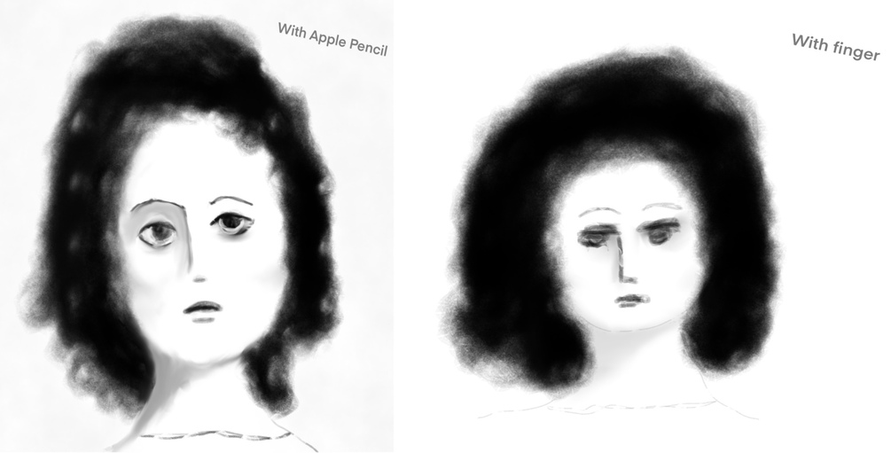 Use a thick brush setting for hair, a thin setting for sketching. (Shadows in sample image were smudged.)